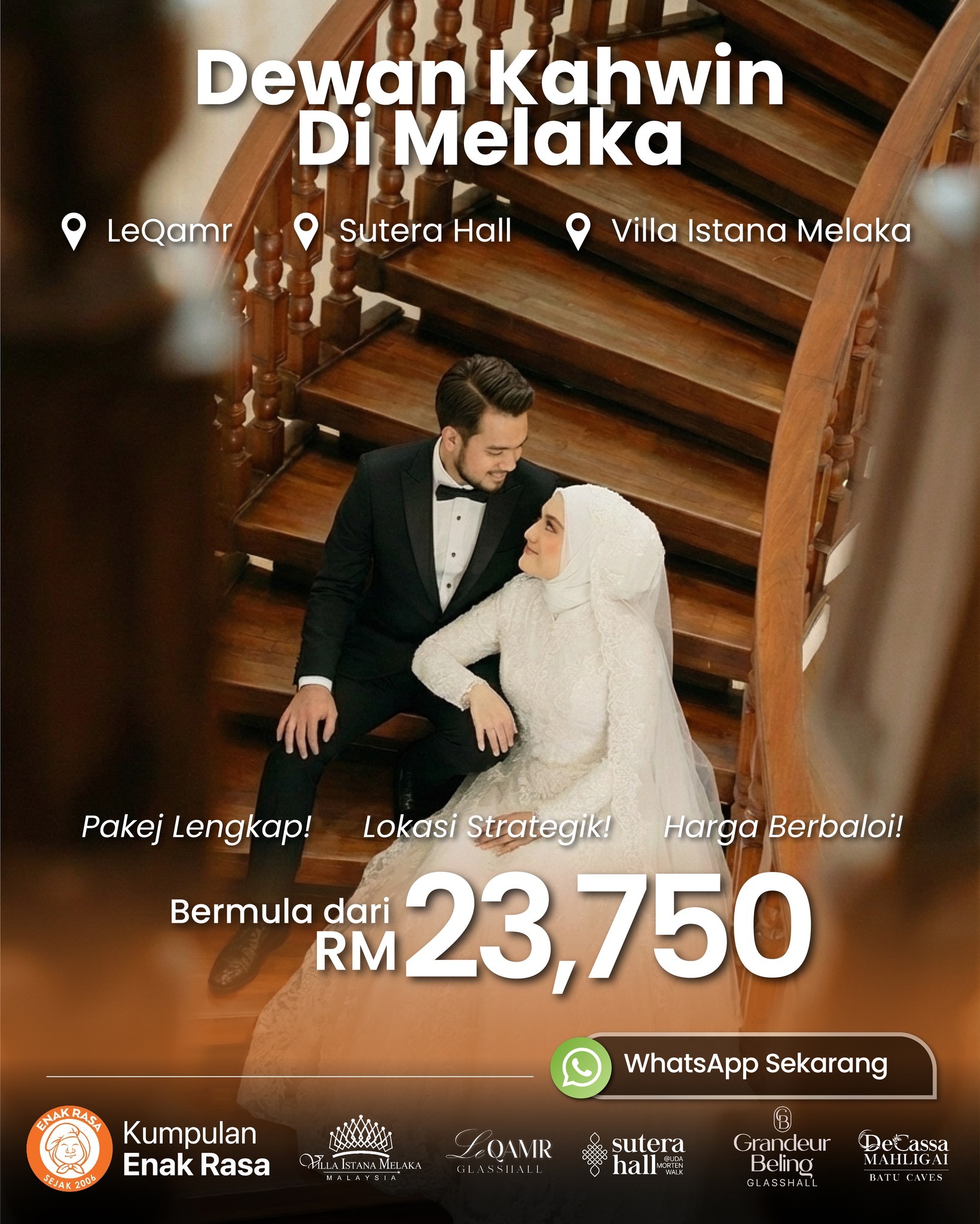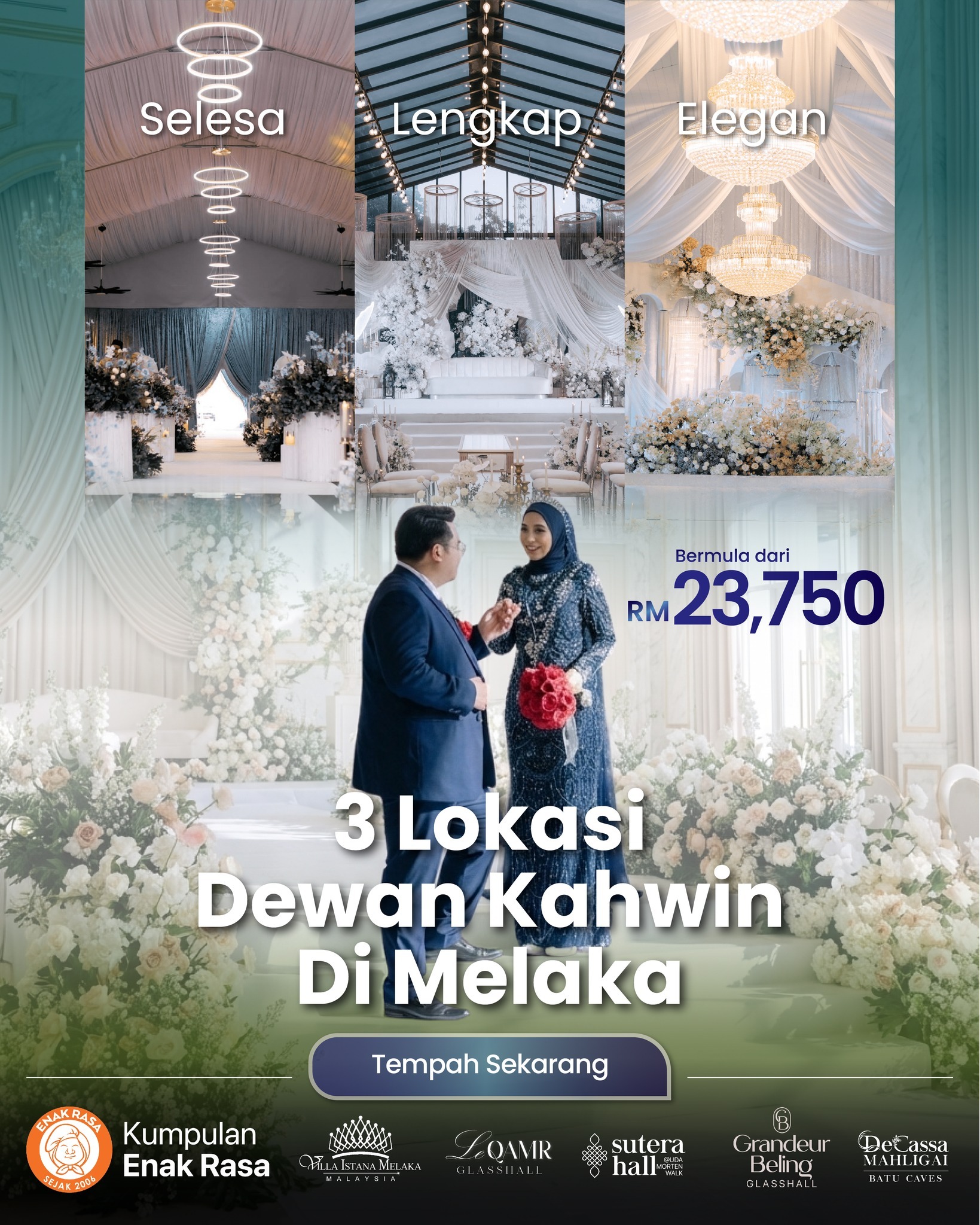 Raikan cinta abadi anda tanpa sebarang kerumitan. Pakej perkahwinan lengkap Kumpulan Enak Rasa menawarkan dekorasi memukau, katering lazat, dan perancangan teliti untuk merealisasikan majlis impian anda di Tiga Lokasi Dewan Villa Istana Melaka, Le Qamr Glasshall dan Sutera Hall.